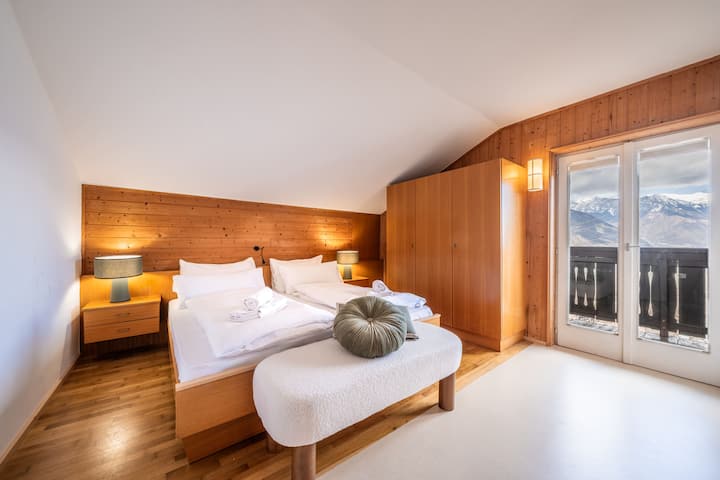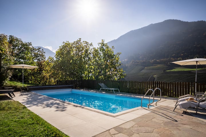 מוקפת במטעי תפוחים ציוריים, תמצאו גינה מרווחת עם מיטת חציר ריחנית, בריכה מחוממת ונופים עוצרי נשימה של מראנו וההרים שמסביב.