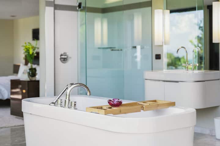 חדר הרחצה הוא מקום מפלט שליו, עם אמבטיה מפוארת עם נוף פרטי. מי מעיין זורמים במקלחת, ואנחנו מספקים פריטים חיוניים לאמבטיה פרימיום, מלחי אפסום ומוצרי טיפוח לעור כדי להירגע. כל מוצרי הטיפוח והרחצה הם באיכות מעולה, ומציעים מגוון מפנק במהלך השהות שלכם.