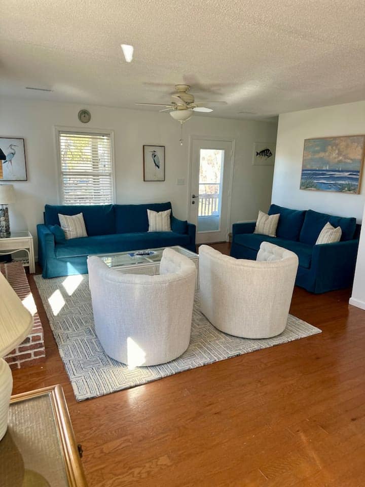 הסלון הפתוח הזה הוא השילוב המושלם של נוחות וקסם חופים. החלל, המעוגן בשתי ספות כחולות מפוארות ומשלימות שני כיסאות מסתובבים לבנים ואלגנטיים, מזמין אתכם להירגע וליהנות מהאווירה השלווה. אח נעים מוסיף אופי לחלל, ואילו הטלוויזיה שלמעלה מספקת בידור לערבים שקטים באזור. חלונות גדולים ממסגרים נופים ציוריים של התעלה, מציפים את החדר באור טבעי ומציעים רקע שליו. עם העיצוב המוקפד והזרימה החלקה שלו, הסלון הזה הוא מקום מפלט מזמין גם למנוחה וגם לחיבור.