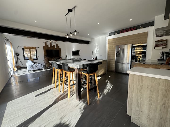 בית החווה הפרובנסלי הזה עם בריכת שחייה בבוקר עם בריכת שחייה כולל שטח של 190 מ"ר, בשני מפלסים ממוזגים, מעוצב בסגנון מודרני.