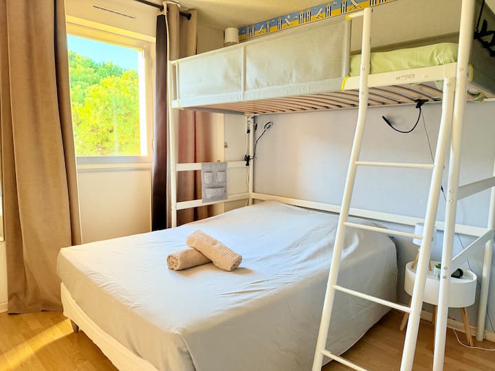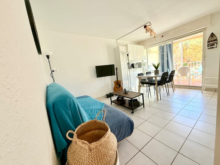 דירת 2 חדרים בגודל 37 מ"ר עם לוגיה המשקיפה על התעלה + Wi-Fi וחניה פרטית במגורים "פורט רפאל" ליד הפלאגט (250 מ', הליכה של 4 דקות) ומפרץ Grande Conque (350 מ' או הליכה של 5 דקות, חוף חול שחור, ייחודי באזור בשל הסלע הוולקני). המגורים מעניקים גישה ישירה לרציפים של הנמל הקדמי להליכות לאורך הסירות.