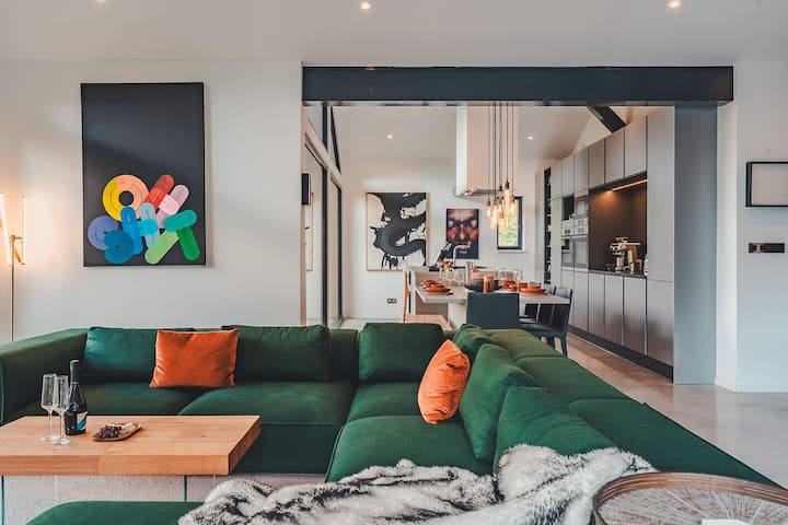 אזור המגורים, האוכל והמטבח הפתוח הגדול שטוף באור טבעי, הודות לחלונות מהרצפה עד התקרה המשתרעים על פני אורך החדר והתקרה המקומרת הגבוהה. יצירות אמנות מקוריות ייחודיות ממוקמות בקפידה לאורך כל הדרך, ואילו הספה הגדולה מזמינה חברותיות ומחברת בין הנופים החיצוניים השופעים לבין הפנים.