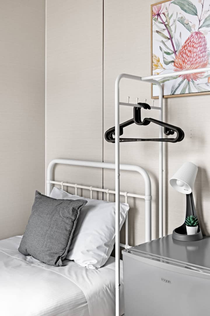 חדר השינה הפרטי שלכם עם מיטת יחיד מרוהט בקפידה כדי להבטיח שהייה נוחה.