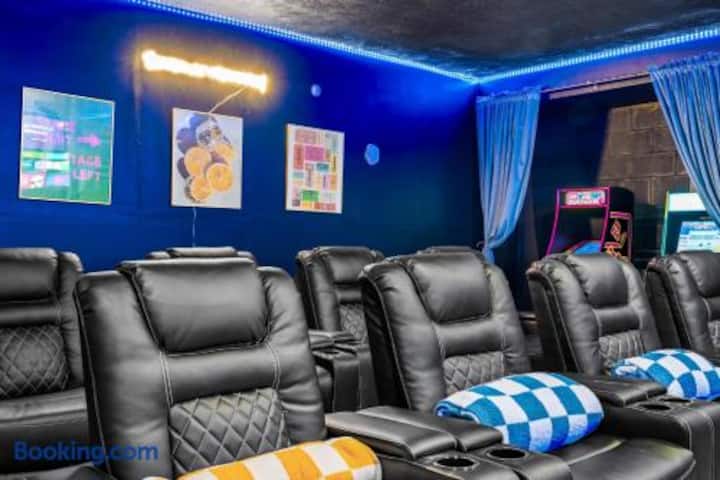 🎥 חדר קולנוע/ארקייד: 8 כורסאות נפתחות חשמליות, טלוויזיה חכמה 86 אינץ' ומערכת סאונד LG, עמדת פופקורן, ארקייד משפחת סימפסון ו-14 משחקי פק-מן קלאסיים