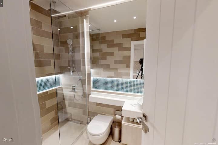 חדר הרחצה האופנתי מצויד במגבות מפנקות ומוצרי רחצה חיוניים כדי להבטיח שהייה ללא דאגות.