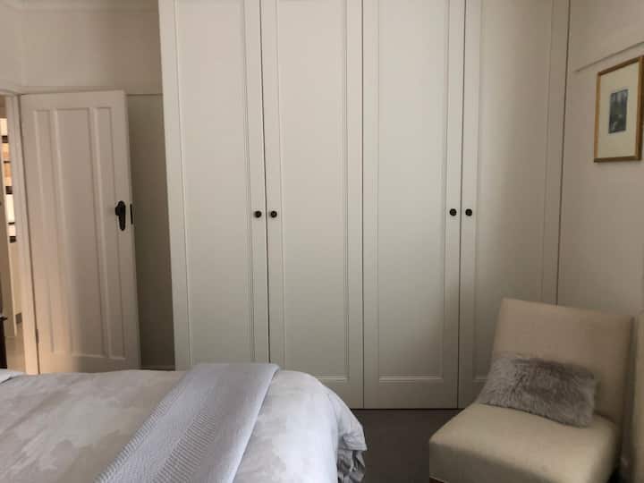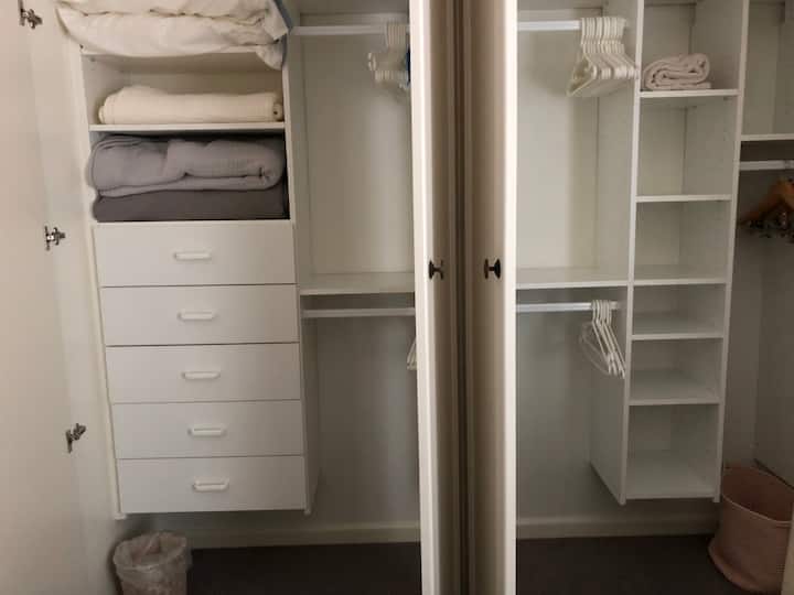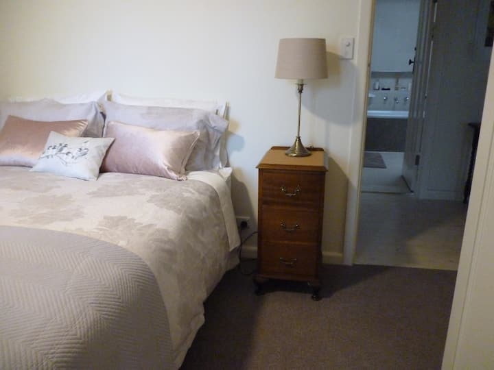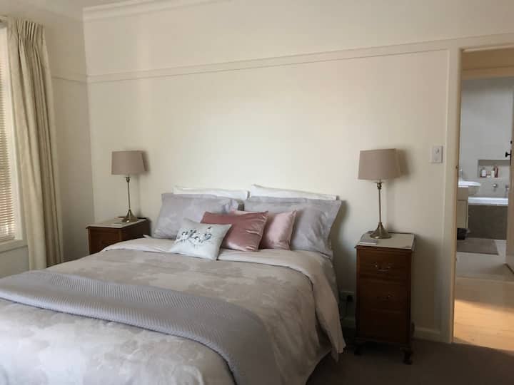חדר שינה שקט ונוח עם מיטת קווין סייז + חדר רחצה פרטי + טרקלין/פינת אוכל
