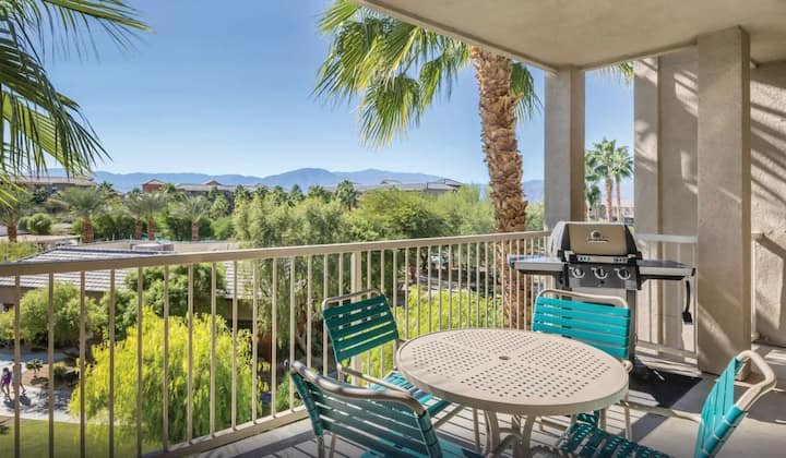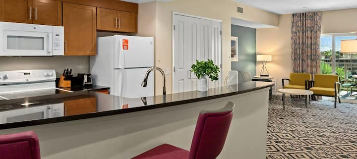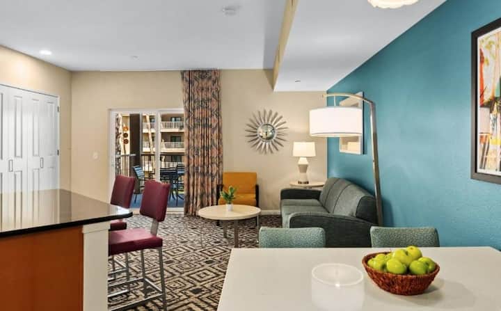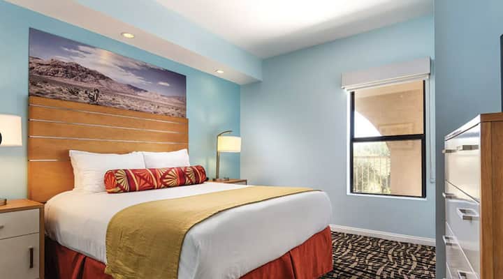 להירגע עם חברים ובני משפחה בנופש המרווח שלכם עם 2 חדרי שינה ו -2 חדרי רחצה! כולל חדר שינה ראשי עם מיטת קינג סייז, חדר שינה שני עם מיטות זוגיות ומיטת קווין סייז מרפי בסלון. מטבח מאובזר במלואו, מרפסת פרטית וחלל מגורים נעים. שירותים לאורח בסגנון אתר נופש כוללים בריכות, נהר עצל, ספא, חדר כושר, חדר משחקים נרחב ועוד. במרחק דקות ספורות מכרכרה (עם שירות הסעות), גולף ועץ יהושע - מושלם לחופשה משפחתית או לפסטיבל!