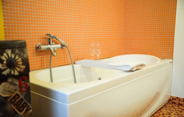חדר הרחצה הצהוב, לשימוש בלעדי בחדר, מעוטר בפסיפסים ומצויד בג'קוזי עם מלחי אמבטיה בחינם לאורחים.