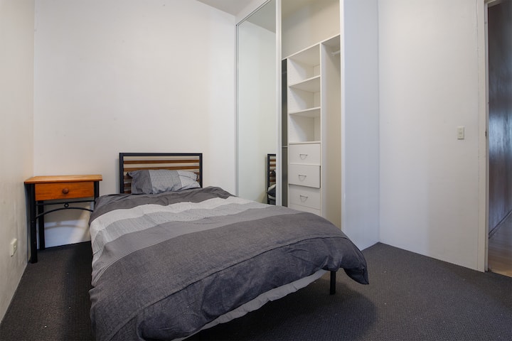 חדר אחד עם מיטת קינג סייז ליד שדות התעופה וחנויות העיר