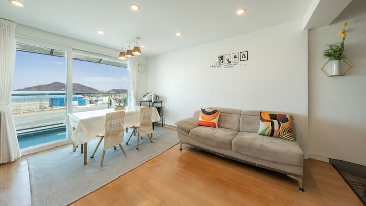 ליהנות מרגע ריפוי מרגיע עם הכלב שלכם בסונצ'און, רגע מרגיע של ריפוי עם הכלב שלכם, לצפות בזריחה ובשקיעה היפהפיות ולהירגע.