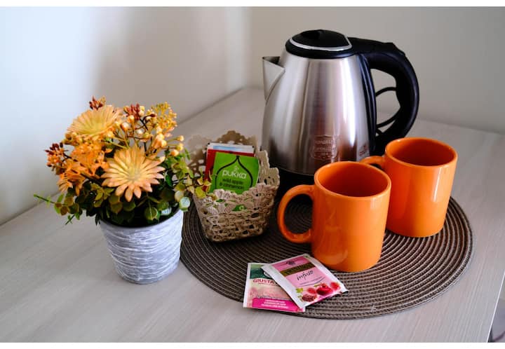 - מזרקה חשמלית עם ספלים ומבחר תה וחליטות