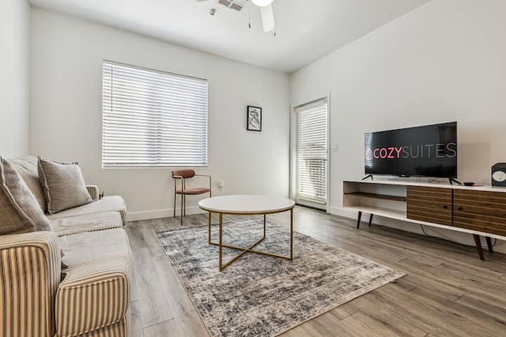 CozySuites מביא לכם בגאווה את הדירה החדשה המשובחת ביותר בגלנדייל שנמצאת במרחק צעדים ספורים (ניתן להליכה!) מהאצטדיון וכמה ממסלולי הקניות, האוכל והגולף הטובים ביותר בפיניקס רבתי! הדירה הזו מושלמת לכדורגל, לפנאי, לציפורי שלג, לאימוני אביב ולנסיעות עסקים! כשתסיימו לסייר באזור, בואו לטבול בג'קוזי עם חברים וליהנות מלילה ליד המדורה! בתוך כל דירה תוכלו ליהנות מהנוחות של הבית שמגיע לכם והרבה יותר!