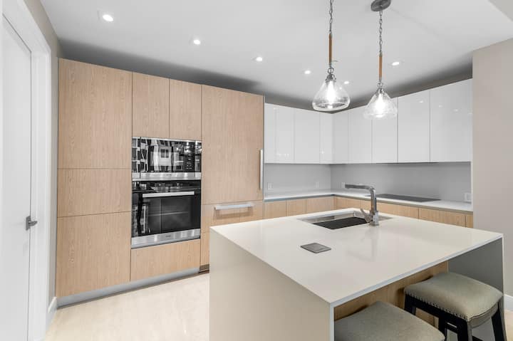 המטבח המעוצב הזה הוא חלום לכל מי שאוהב לבשל — או פשוט נהנה מאסתטיקה טובה. עם שילוב של ארונות עץ טבעיים וארונות עליונים לבנים מבריקים, הוא מציע שפע של מקום אחסון תוך שמירה על מראה נקי ומודרני. אי מפל קוורץ משמש גם כאזור הכנה ובר ארוחת בוקר, עם כיסאות בר לארוחות מזדמנות.