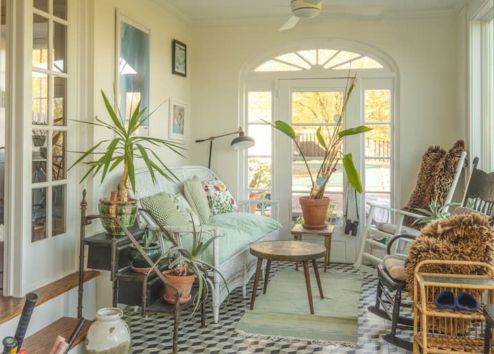 בקומה הראשונה יש גם סלון חמוד עם קמין עצים, ודלתות זכוכית כפולות שנפתחות לחדר הגינה שלנו. הירגעו על ספת הנצרים העתיקה שלנו, מוקפים בצמחים, ותיהנו מהאור מהשקיעות המסנוורות שלנו - אפשר לראות כמה מהנופים והצבעים המדהימים בתמונות שפרסמנו. הישיבה בחדר הזה היא אחד המוקדים שאנחנו הכי נהנים מהם בבית.