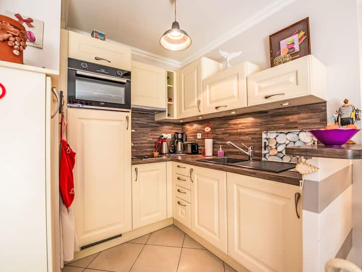 מטבח פתוח (תנור, 2 כיריים מזכוכית קרמית, טוסטר, קומקום, מיקרוגל, מכונת קפה חשמלית). חדר רחצה, שירותים נפרדים, חימום חשמלי, מיזוג אוויר. מרפסת 12 מ"ר, פונה דרומה, גינה 28 מ"ר, מיקום פונה דרומה. רהיטי מרפסת, מנגל חשמלי. מתקנים: מכונת כביסה, מיטת תינוק ומייבש שיער. אינטרנט (Wi - Fi, תוספת). מקום חניה n 800. לתשומת לבכם: לא מעשנים בלבד. מותר להכניס לכלב/חיית מחמד אחת לכל היותר. טלוויזיה בלבד FR. גלאי עשן. הצעה על ידי אדם פרטי על פי סעיף 155, IV של CGI.