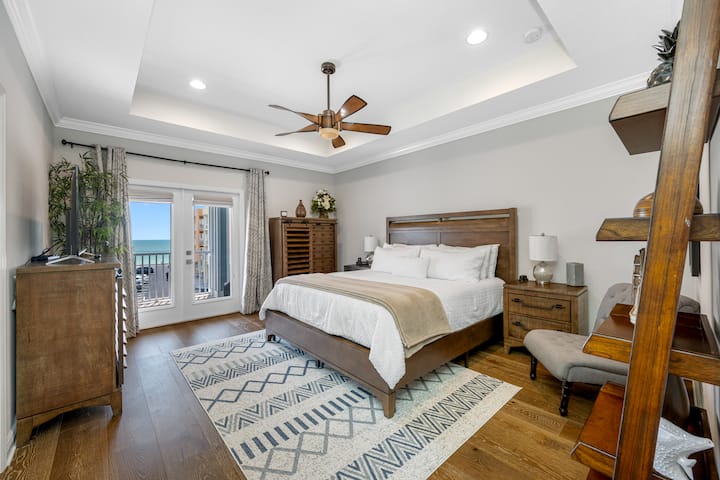🌴 Master Suite: King bed, cozy fireplace, and private Gulf-view balcony