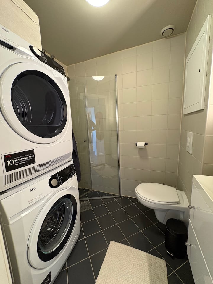 חדר רחצה: חדר רחצה אריחים עם מקלחת, שירותים, מכונת כביסה ומייבש כביסה