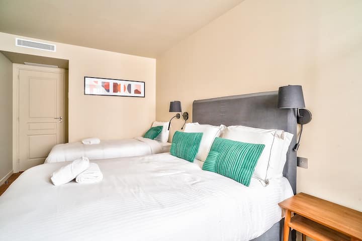 הדירה המשופצת במלואה בגודל 115 מ"ר אידיאלית לאירוח של עד 13 אנשים לשהייה פריזאית נוחה.