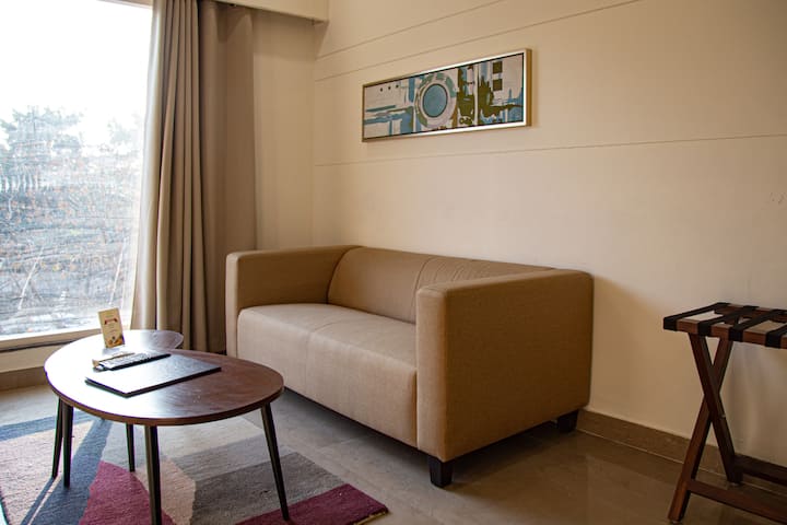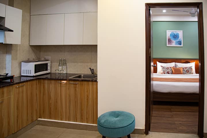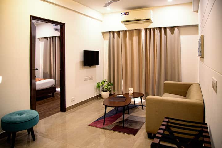 הזמינו את שהותכם בדירת 1BHK שלנו עם מרפסת וגלו שילוב מושלם של נוחות בלב גורגאון!