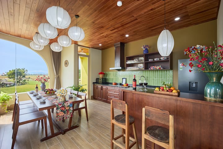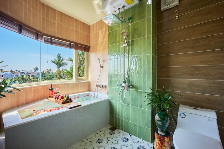 מהמיטה שלכם, תוכלו להביט בנוף וייטנאמי קלאסי: דקלים חינניים, עצי בננה שופעים ושדות שמנצנצים מירוק תוסס ועד זהב בשלים. בין אם אתם נהנים מאמבטיה חמה או נרגעים במרפסת, אתם תתלהבו מהנוף השלו והרומנטי של הכפר.