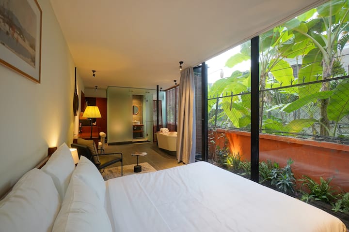 כל פינה בחדר נפתחת לטבע - אור השמש עובר בעדינות דרך ענפים עלים, והצמחייה שמסביב מחוץ לקירות הזכוכית יוצרת תחושה של חיים ביער קטן ממש בלב העיר.