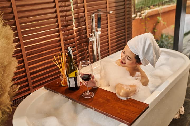 • חדר רחצה: חדר רחצה פרטי עם אמבטיית אבן יפה לרגיעה עמוקה