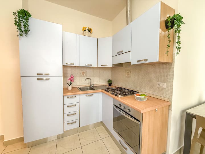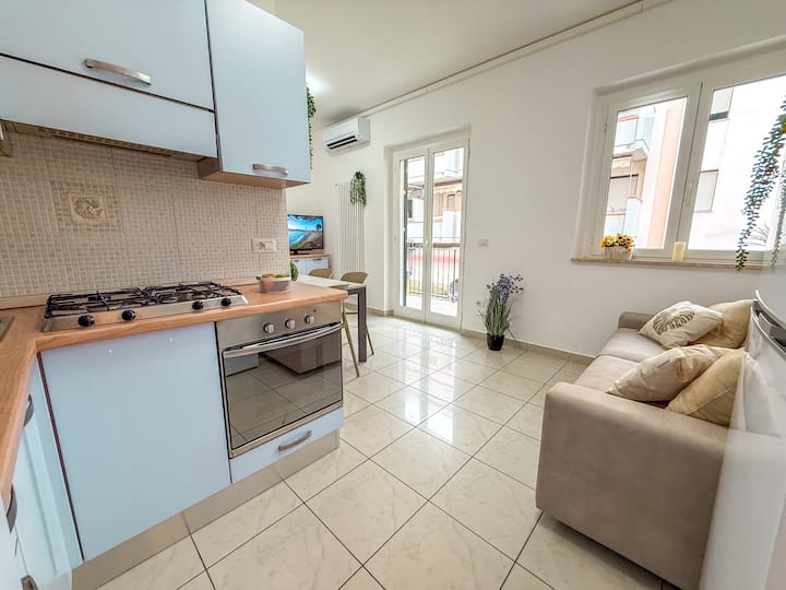 דירת סקרמנטו, דירה Via M. Serao Angolo Ristori, 150 מטר מהים. צילום תקריב עם מעלית. כניסה לסלון עם מטבחון פתוח וספה זוגית נפתחת, חדר שינה זוגי מרווח, חדר אמבטיה עם מקלחת, מרפסת היקפית עם ארון קטן. מתאים ל-4 אנשים.