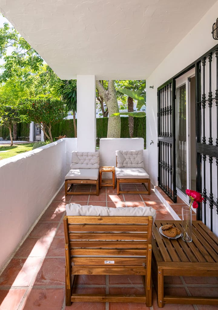 - מרפסת סגורה: ממוקמת בקומת הקרקע עם נוף נהדר לגינה. מרוהט עם שולחן קטן וכיסאות חוץ, מושלם לרגע של רוגע.