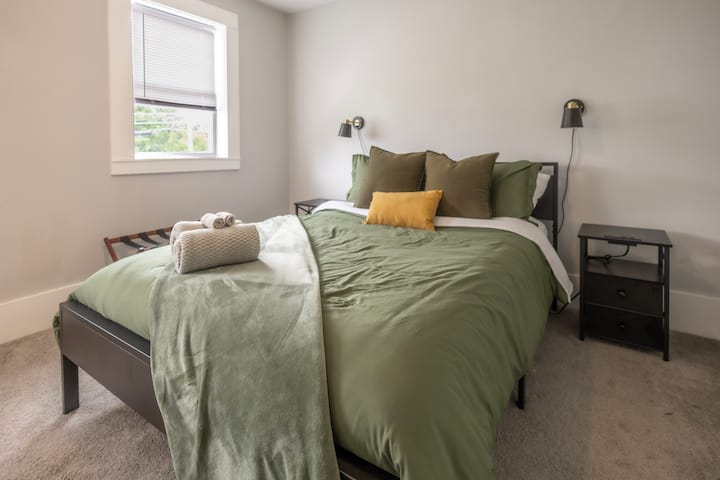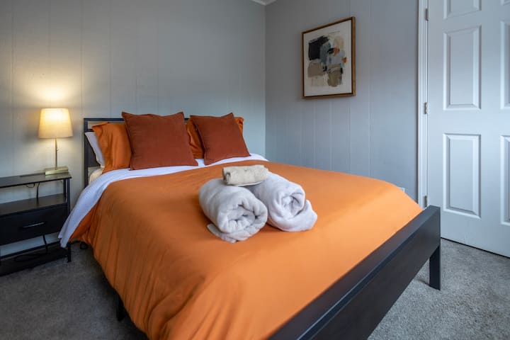 הבית הזה עם 2 חדרי שינה וחדר רחצה אחד מציע מיטת קווין סייז אחת ומיטה אחת עם מזרן יוקרה וחלל שינה נוסף על הספה.