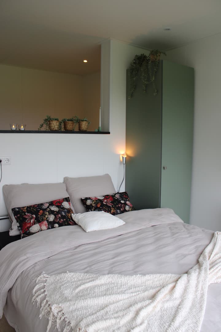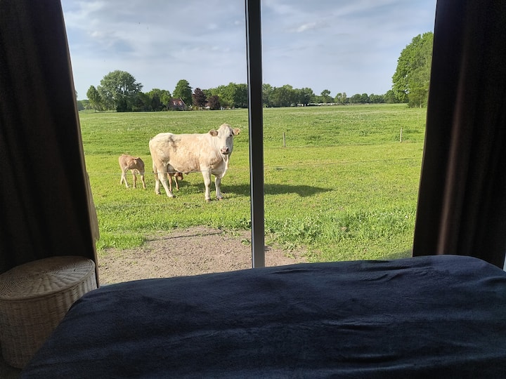 הירגעו במיטה הכפולה הגדולה עם כריות מפוארות ושמיכת פוך רכה לשינה ערבה. פתחו את הווילונות בבוקר ותביטו רחוק ככל שתוכלו בנוף הפנורמי עם מרחבים ופרות עם עגליים.
