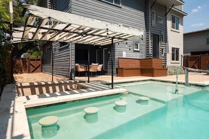דירת נופש מרווחת באוסטין עם 7 חדרי שינה ו-5 חדרי רחצה בשני בתים מעוצבים - אחד עם 5 חדרי שינה, השני עם 2 חדרי שינה - מושלם לקבוצות גדולות, מפגשים ומשפחות. הנכס המגודר הזה במזרח אוסטין מציע שני מטבחים מלאים, בריכה פרטית עם ספא, בר במרכז הבריכה ובקתות לצד הבריכה. ליהנות מטלוויזיות חכמות בכל חדר, Wi-Fi מהיר, עיצוב פנים ייחודי ומרחב להירגע או ליהנות מאפשרויות בידור. רק כמה דקות ממרכז אוסטין, מסעדות מובילות, חיי לילה, מוזיקה חיה ומקומות חמים מקומיים.
