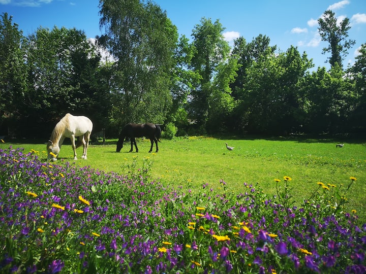 הבית עצמו ממוקם בתוך חווה עירונית קטנה, עם מגוון ביולוגי יפהפה ופראי. תאבדו את עצמכם בגנים שלנו, בין העצים והנדנדות, הבריכה והסולריום. צאו לטייל והיפגשו עם הסוסים הידידותיים שלנו או שוכבים על הדשא עם הספר האהוב עליכם, תוך הקשבה לשירת הציפורים הקסומה.