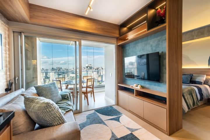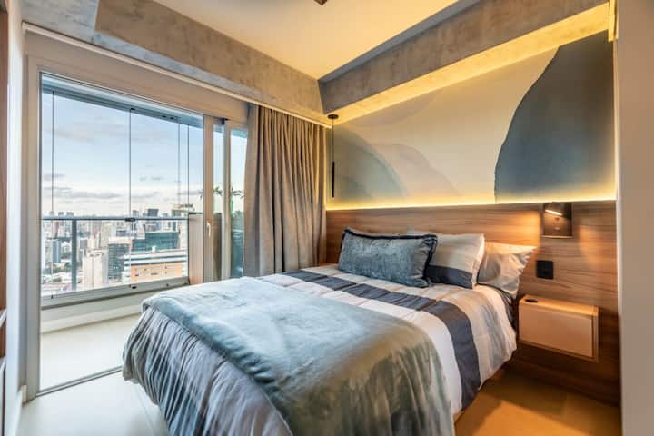 דירה 2503 ללא נהר אחד: מודרנית, עם Wi-Fi, מיזוג אוויר, שולחן עבודה ונוף מדהים למרג'ינל פינheiros. אידיאלי ל-4 אנשים. מיטה זוגית + ספה נפתחת, מטבח מאובזר, מצעים ושירותים לאורח פרימיום. ליד גשר אוסביו מטוסו, קרוב ל-USP, רכבת תחתית ובתי חולים. בית דירות עם בריכת אינסוף, חדר כושר, סאונה, חדר כביסה, מינימרקט, חדר פילאטיס וחניה מאובטחת. נוחות ומיקום מעולה! שער צ'ק-אין דיגיטלי עם אבטחה מסביב לשעון