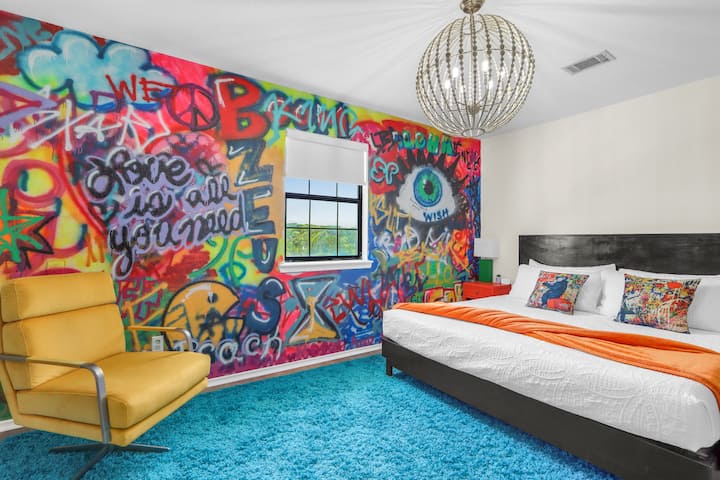 למעלה, בחדר השינה 2 יש מיטת קינג סייז מפוארת נוספת, כיסא בולט וציור קיר שני מרשים, ואילו בחדר השינה 3 יש מיטת קינג סייז שלישית עם יצירות אמנות נועזות עוד יותר. שני חדרי השינה חולקים חדר רחצה מעוצב עם שילוב אמבטיה/מקלחת ואביזרים מודרניים המשלימים את הנושא האמנותי והמוזר של הנכס.