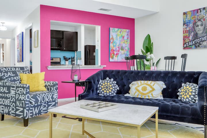 היכנסו לסגנון נועז ויוקרה רגועה ב-Urban Retreat, דירת נופש תוססת בהשראת פופ ארט הממוקמת בלב קניון לייק, טקסס. חלק מקוטג'ים ייחודיים של Coddiwomple - קהילת בתים עירוניים בת ארבע יחידות - בית בלתי נשכח בן 3 חדרי שינה ו-2 חדרי רחצה מספק אישיות רצינית, נגיעות זוהר, וכל הנוחות של הבית, מה שהופך אותו למקום המפלט המושלם לקבוצות של חברים, מפגשי משפחה, מסיבות כלה או זוגות שנוסעים יחד.