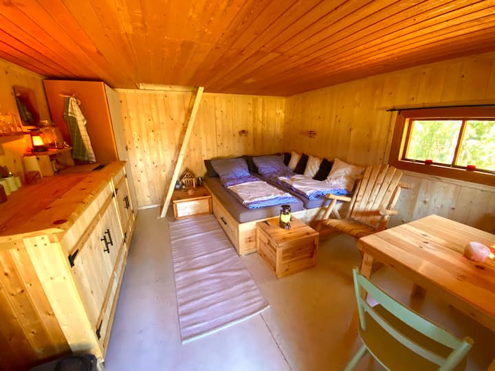 הבקתה לא מחוברת לרשת החשמל, אבל מצוידת בסוללה סולארית ובמערכת מים בסיסית עם מכלי 20 ליטר לאזור המטבח הקטן ולמקלחת החיצונית. אתם יכולים למלא את המיכלים בבית הראשי.