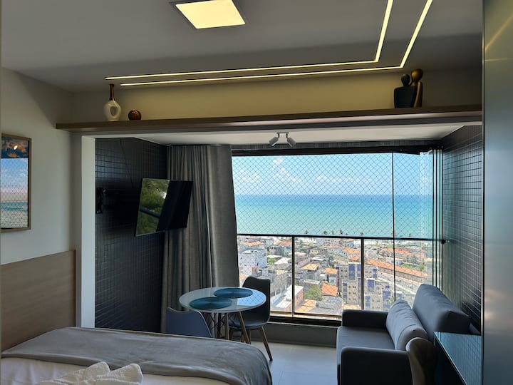 דירת סטודיו בבניין מודרני, נוף ים נהדר למרפסת ומטבח מלא