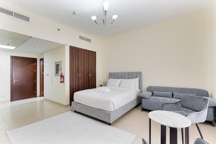 חלל הסטודיו הבהיר והמזמין הזה כולל מיטת קווין סייז מפנקת, פינת ישיבה נעימה עם ספה אפורה אלגנטית ומרפסת פרטית המשקיפה על קו הרקיע של ספורט סיטי. חלונות גדולים ממלאים את החדר באור טבעי, ואילו וילונות האפלה מבטיחים לילה רגוע. עם פינת ישיבה מעוצבת ועיצוב מודרני בכל פינה, זה המקום המושלם להירגע או להירגע אחרי יום בדובאי.