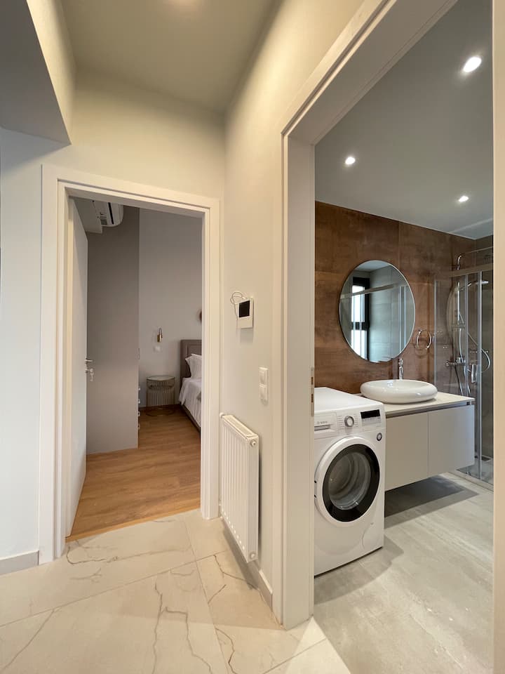 חדר הרחצה המלוטש והפונקציונלי מספק את כל מה שצריך כדי להתרענן, כולל מים חמים, מייבש שיער, שמפו וג'ל רחצה לחוויית רחצה מרגיעה. בנוסף, יש מכונת כביסה זמינה לצורכי הכביסה שלכם.
