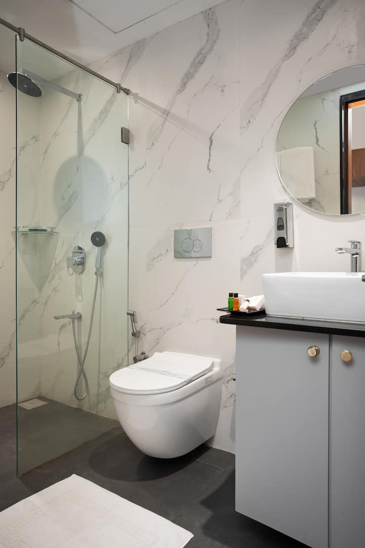 יש לנו 2 חדרי שינה ממוזגים עם חדר רחצה צמוד בקומה הראשונה. בחדר הרחצה יש דוד גייזר (שלוקח לפחות 15 דקות להרתיח) למים חמים. מגבות, מפיות, מגבות, מפיות, מוצרי רחצה כמו ג'ל רחצה, שמפו ומרכך, יסופקו מזרני אמבטיה.