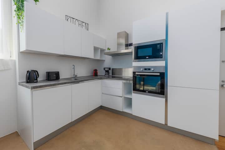 המטבח הלבן המינימליסטי מאובזר במלואו לבישול עצמאי: