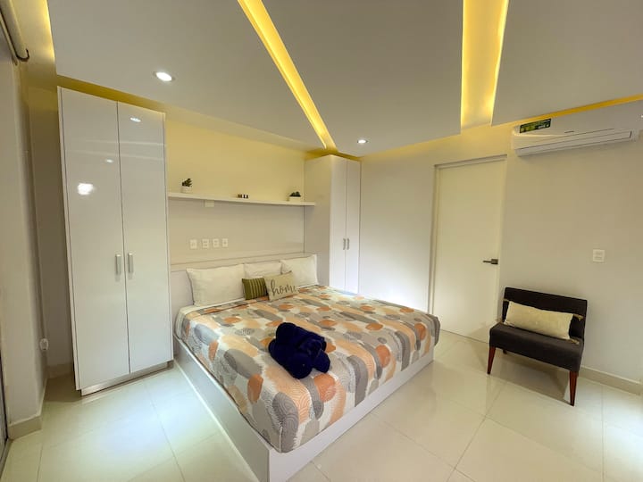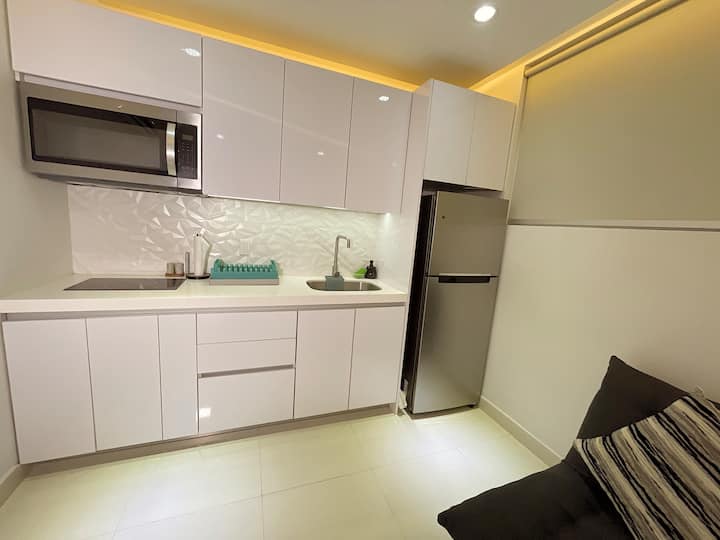 חדר השינה מוביל ישירות לחדר הרחצה. בין אם אתם מתכננים לבשל או לא, יש לנו מטבח מאובזר כי אנחנו רוצים שזה יהיה הבית שלכם. שימו לב שאין תנור (חם מדי לבשל בכל מקרה וייתכן שבן הזוג שלכם ירצה לקחת פסק זמן מהמטלה הזו!). בכל מקרה, מסעדות יוצאות דופן במרחק הליכה קצרה. המטבח, פינת האוכל והטרקלין הם תוכנית פתוחה. בחדר השינה יש טלוויזיה עם מסך רחב בגודל 45 אינץ'. יש לנו את שירותי הסטרימינג הבאים שאתם יכולים לגשת אליהם עם החשבון שלכם: Netflix, YouTube ו-Amazon. בריכה על הגג מציעה נוף עוצר נשימה בזמן שאתם נרגעים. לרוב יש מישהו שיקבל את פניכם למטה בכניסה לבניין. 24/7.