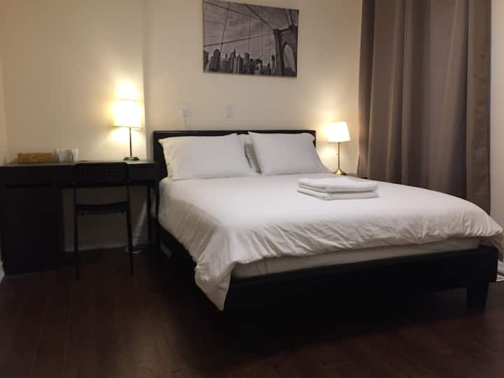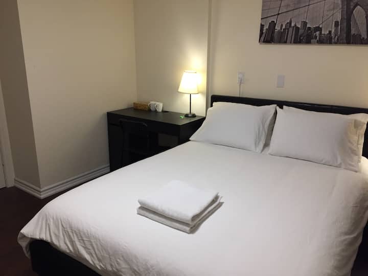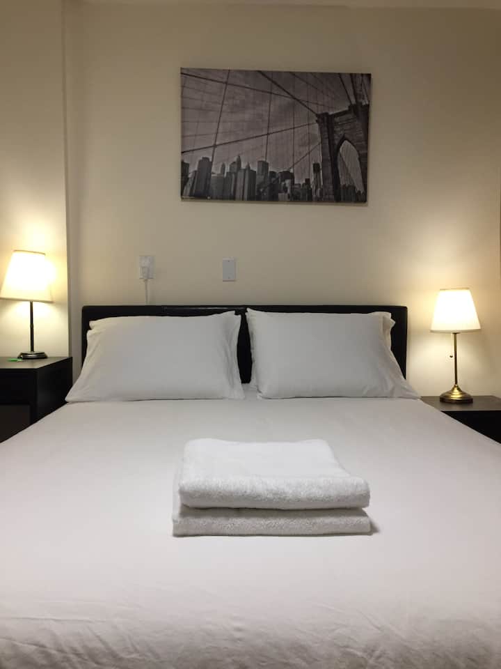 מיטת קווין סייז אחת עם חדר רחצה פרטי ליד הרכבת התחתית