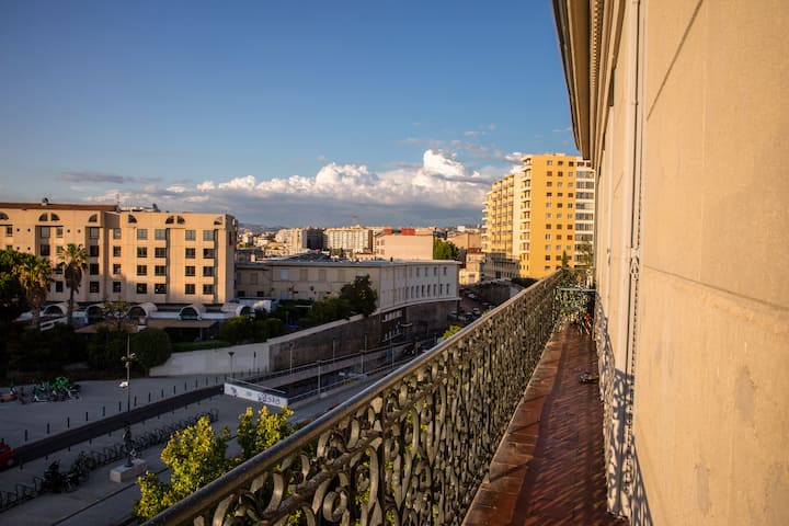 דירה גדולה זו בגודל 105 מ"ר היא המקום האידיאלי לחופשה בלתי נשכחת או לפרויקט עבודה הרחק מהבית. ממוקמת בקומה החמישית (העליונה) של בניין אבן גיר יפהפה בסגנון האוסמן משנת 1895, היא נמצאת ממש מעבר ומעל תחנת הרכבת סן צ'רלס ומציעה נוף לים התיכון מהמרפסת הארוכה והצרה. הדירה מוארת הודות לדלתות בגובה 2.5 מ' שיוצאות מהסלון ושני חדרי השינה אל מרפסת צרה וארוכה, שבה אפשר ליהנות מקפה וקרואסונים בבוקר בשולחן ביסטרו קלאסי ולצפות בנוסעים יורדים במדרגות השיש הגדולות מתחנת הרכבת אל העיר למטה. כל הרכבות חשמליות, כך שהמיקום שקט יחסית ואיכות האוויר טובה.