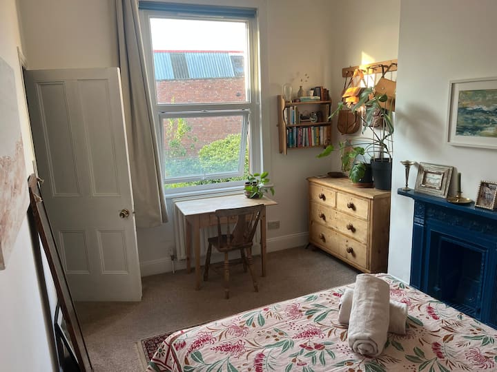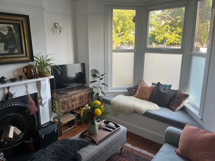 סלון: מרחב נעים ומואר בחזית הבית, עם חלון מפרץ, רצפות עץ מפוספסות וקמין ויקטוריאני מקורי — מושלם להתכרבל אחרי יום של סיור בעיר. טלוויזיה עם נטפליקס, iplayer וערוצים רגילים.
