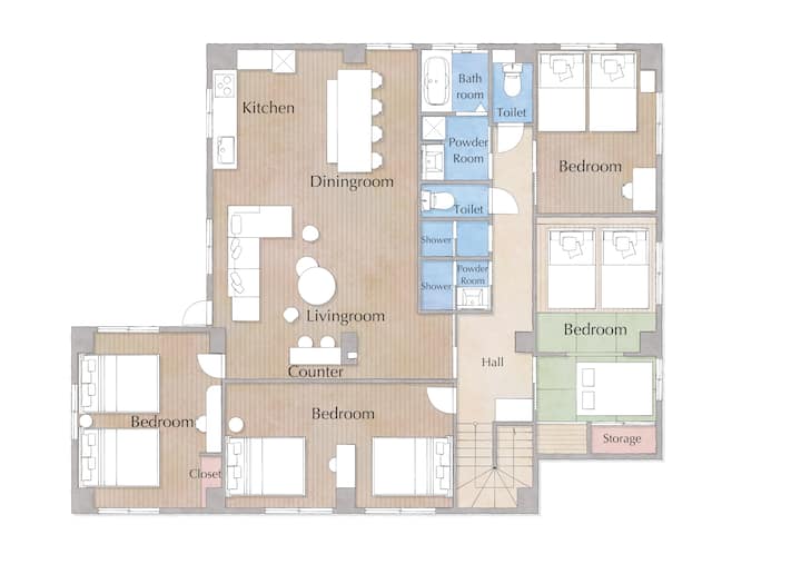 155 מ"ר קומה אחת | סלון 50 מ"ר | 4 חדרי שינה | 3 חדרי רחצה, 3 שירותים | גינזה, צוקיג'י, טויו, דאיבה, דיסני