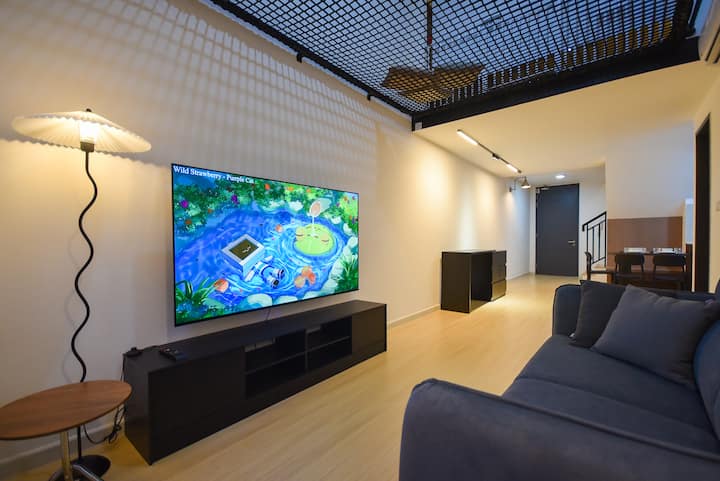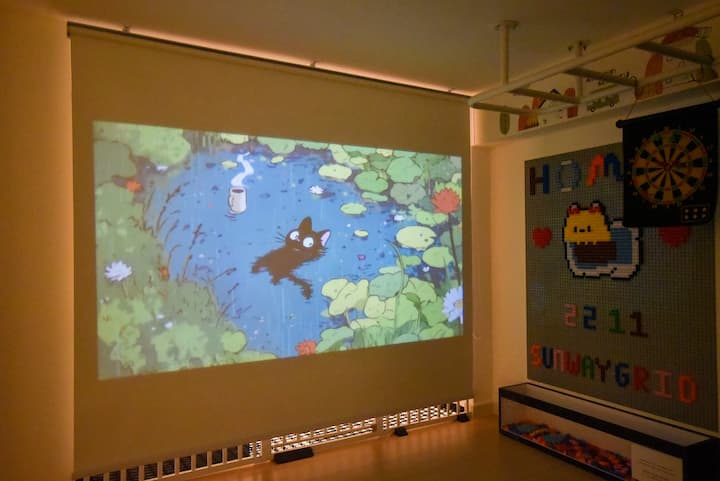 לופט מודרני בסאן-וויי עם ערסל רשת שמיים ומקרן, מושלם ללילות סרטים רגועים ולבילוי ראוי לאינסטגרם.