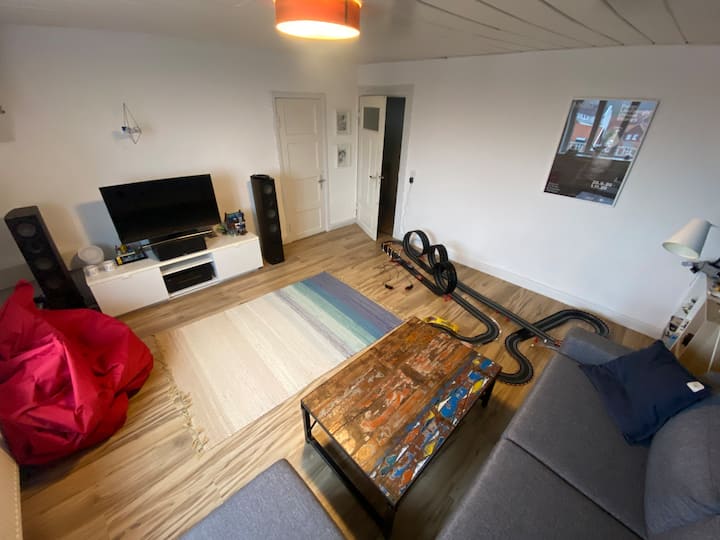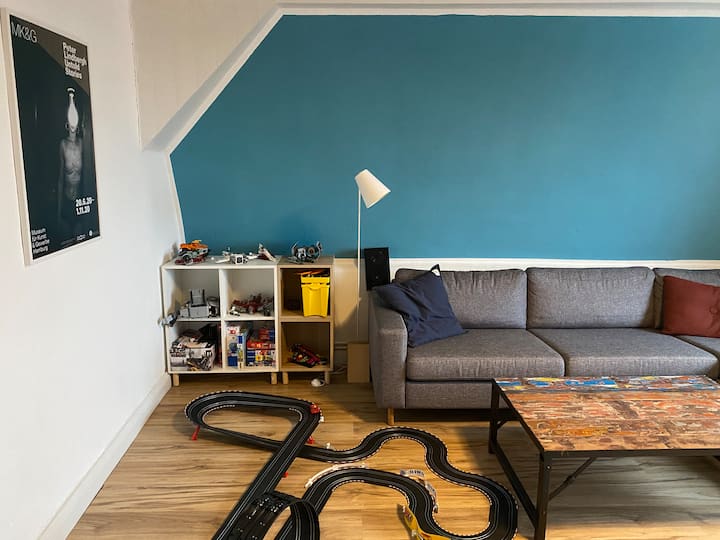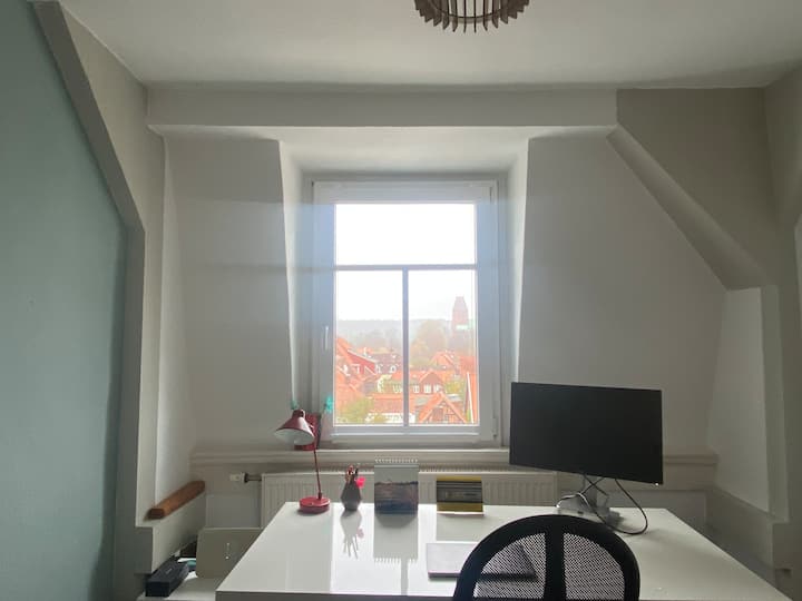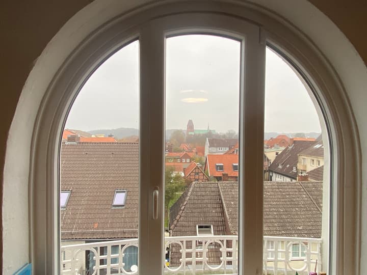 הדירה שלנו בגג, בגודל 80 מ"ר, מוקפת בארבע אגמים ונמצאת בלב חצי האי הקתדרלה בראצבורג היפהפייה. הדרך למעלה שווה את זה, כי כשמסתכלים מהחלון, השמיים יפים ורחבים ויש לכם נוף לאגמים ולעיר הקטנה כמו גם לקתדרלת ראצבורג. אנחנו מרגישים מאוד בנוח בדירה שלנו במשך תשע שנים ועכשיו אנחנו רוצים לשתף אותה.