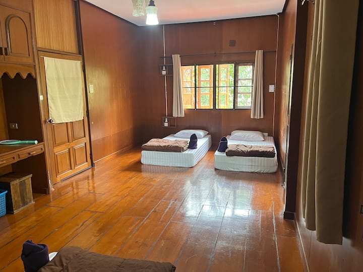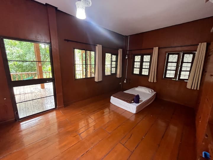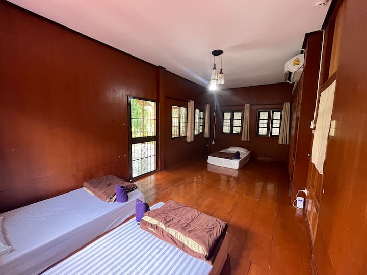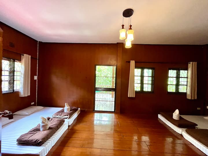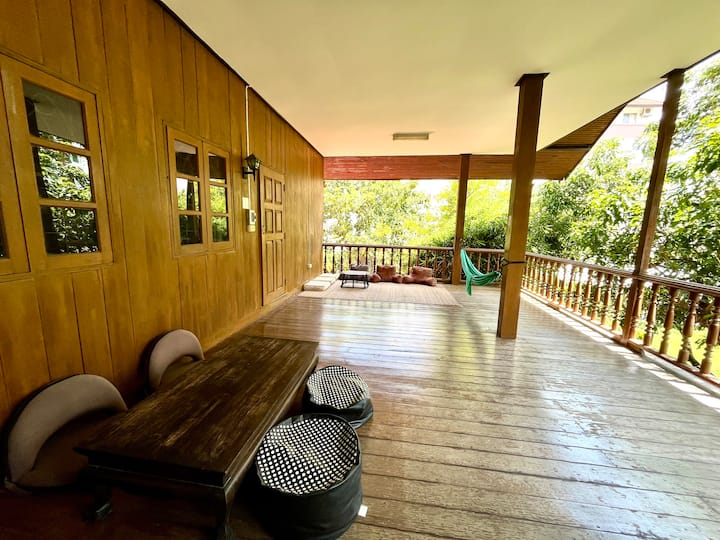חדר שינה גדול עם מרפסת בבית תאילנדי יפהפה.