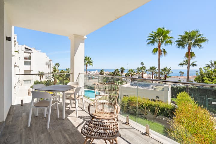 דירת 3 חדרי שינה עם נוף לים, מרפסת ובריכה